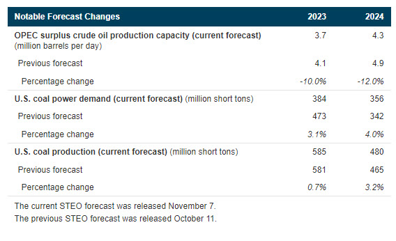 - Global oil supply. We forecast global liquid fuels production will increase by 1.0 million barrels per day (b/d) in 2024. Ongoing OPEC+ production cuts will offset production growth from non-OPEC countries and help maintain a relatively balanced global oil market next year. Although the conflict between Israel and Hamas has not affected physical oil supply at this point, uncertainties surrounding the conflict and other global oil supply conditions could put upward pressure on crude oil prices in the coming months. We forecast the Brent crude oil price will increase from an average of $90 per barrel (b) in the fourth quarter of 2023 to an average of $93/b in 2024.