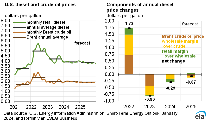 - U.S. gasoline prices. The U.S. average retail gasoline price declines in our forecast as gasoline inventories increase and gasoline crack spreads fall. We expect U.S. gasoline prices to average around $3.40 per gallon (gal) in 2024 and $3.20/gal in 2025, compared with an average of more than $3.50/gal in 2023.