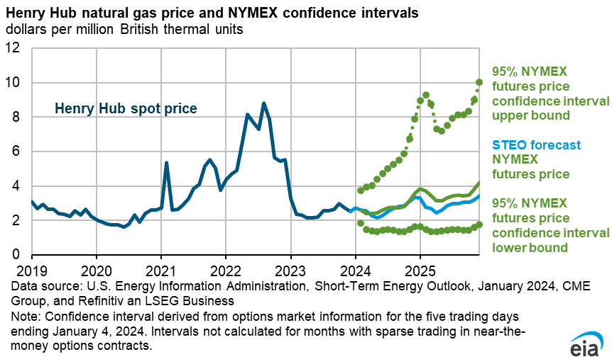 - Natural gas prices. We expect the spot price of natural gas to average $2.70 per million British thermal units (MMBtu) in 2024 and rise to an average of about $3.00/MMBtu in 2025, up from an average of $2.54/MMBtu in 2023. Prices increase because of slowing growth in natural gas production and increasing U.S. liquefied natural gas exports, particularly in 2025 following the addition of new export capacity in late 2024. However, we expect upward price pressures will be limited by relatively flat consumption of natural gas in the electric power sector and persistently high inventories.