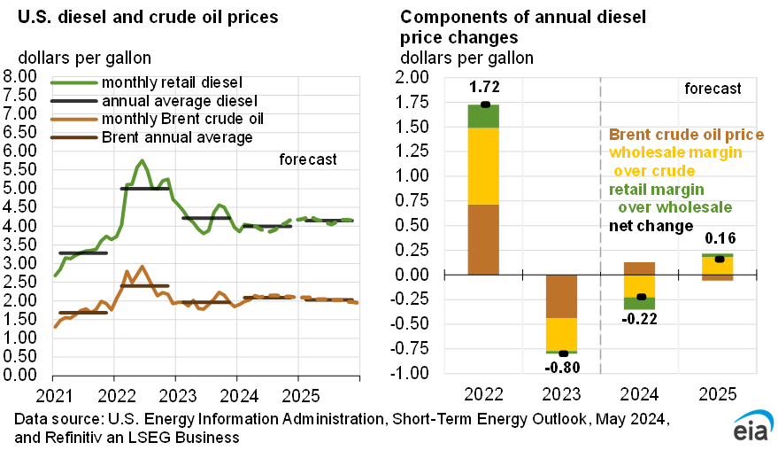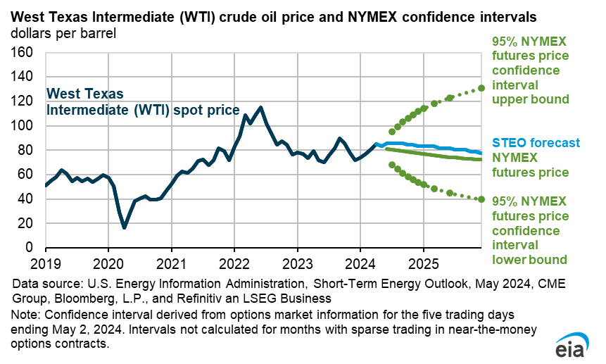 - Global oil prices. We expect voluntary OPEC+ crude oil production cuts and ongoing geopolitical risks will keep the Brent crude oil spot price near $90 per barrel (b) for the remainder of 2024 before falling to an average of $85/b in 2025 as global oil production growth picks up.