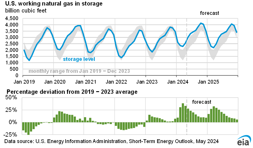 - Natural gas production. We expect U.S. dry natural gas production to fall by 2% from the first quarter of 2024 (1Q24) to 2Q24 as a result of low natural gas prices. We expect 1% less natural gas will be produced in the United States in 2024 than last year before production increases by 2% in 2025 to a record of almost 105 billion cubic feet per day (Bcf/d).
