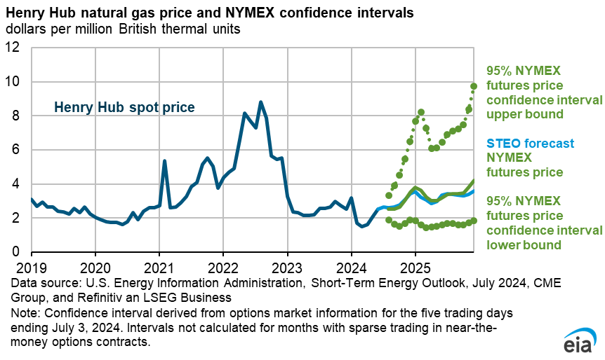 - Natural gas prices. We forecast the Henry Hub natural gas spot price will average almost $2.90 per million British thermal units (MMBtu) in 2H24, up from $2.10/MMBtu in 1H24. Natural gas prices fell in early 2024 because of mild winter weather that reduced demand for natural gas for space heating. However, low prices reduced natural gas-directed drilling and led producers to curtail some production, and we expect dry production of U.S. natural gas in 2H24 to remain near 104 billion cubic feet per day (Bcf/d) compared with a record of more than 106 Bcf/d in December 2023.