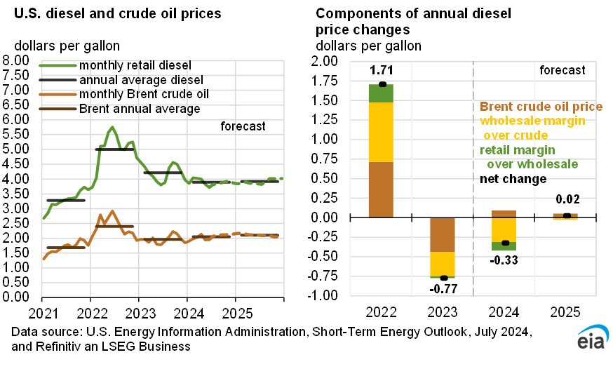 - Crude oil prices. Brent crude oil prices in our forecast average $89 per barrel (b) in the second half of 2024 (2H24), up from $84/b in 1H24. Higher prices in the second half of the year result from our forecast of persistent withdrawals from global oil inventories. We estimate global oil inventories decreased by 0.5 million barrels per day (b/d) in 1H24 and will fall by 0.7 million b/d in 2H24. Inventory withdrawals stem in part from OPEC+ production cuts, which the group announced in early June would remain at current levels until at least the end of September.