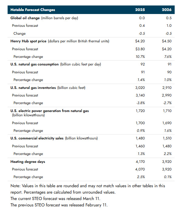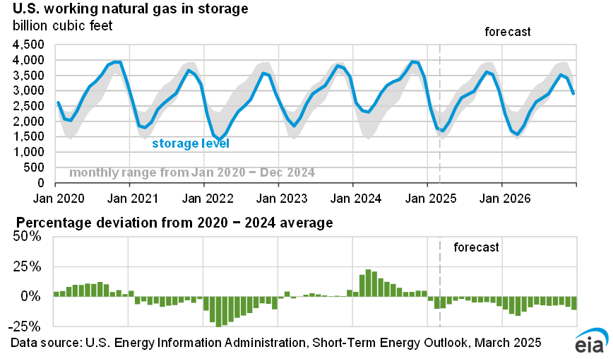 - Natural gas consumption and inventories. Cold weather during January and February led to more consumption of natural gas and large withdrawals of natural gas from inventories. We now expect natural gas inventories to fall below 1.7 trillion cubic feet at the end of March, which is 10% below the previous five-year average and 6% less natural gas in storage than we had expected last month. We also increased our forecast for overall electricity generation over the next two years. As a result, we now expect the electric power sector will use more than 36 billion cubic feet per day of natural gas on average in 2025 and 2026, 2% and 1% more, respectively, than last month. Overall, we expect natural gas in storage to be 4% lower in 2025 and 3% lower in 2026 compared with what we had forecast last month.
