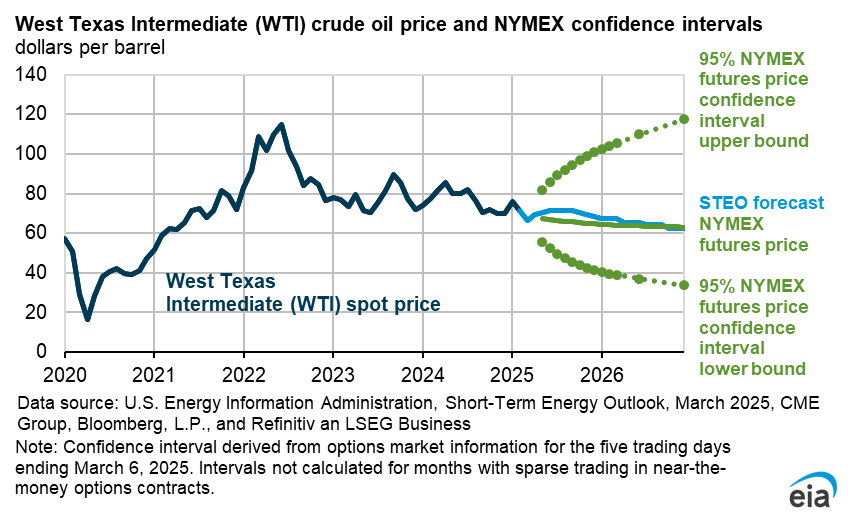 - Global oil markets. Global oil markets will remain relatively tight through the middle of 2025 before gradually shifting to oil inventory builds later this year. We expect global oil inventories will fall in the second quarter of 2025 (2Q25) in part due to decreasing crude oil production in Iran and Venezuela. As a result, the Brent crude oil spot price in our forecast rises from about $70 per barrel (b) to $75/b by 3Q25. However, we expect oil inventories will build and place downward pressure on crude oil prices in late-2025 and through 2026 when we expect OPEC+ unwinds production cuts and non-OPEC oil production grows. As a result, we forecast the Brent crude oil price will fall to an average of $68/b in 2026.