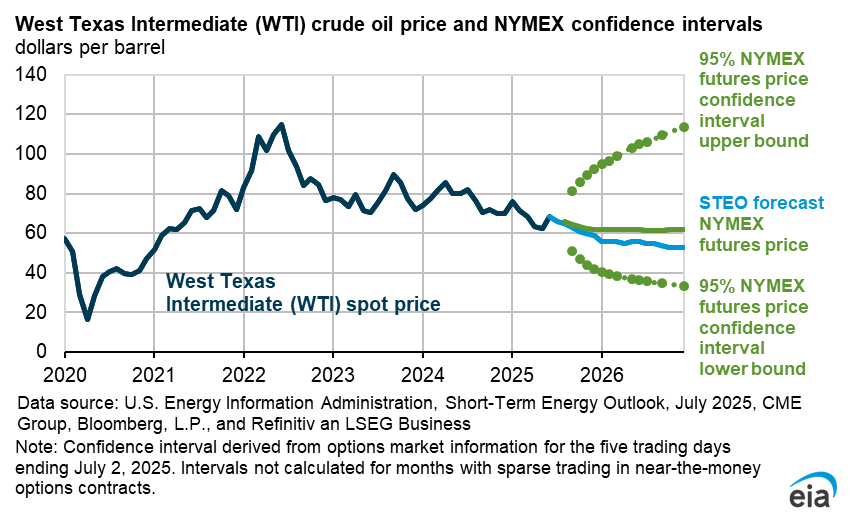 - Global oil prices. The Brent crude oil price in our forecast averages $69 per barrel (b) this year, which is $3/b higher than in last month’s STEO, which was released just before the conflict over Iran’s nuclear program escalated in mid-June. The increase in the forecast is driven largely by higher near-term prices due to a more significant geopolitical risk premium from the conflict. Despite the risk premium, we expect significant global oil inventories builds will put consistent downward pressure on oil prices over the forecast period, with the Brent price averaging $58/b in 2026. This forecast was completed before OPEC+ announced on July 5 that it would raise production targets for August. The announced targets are somewhat higher than the target we assumed when compiling this outlook.