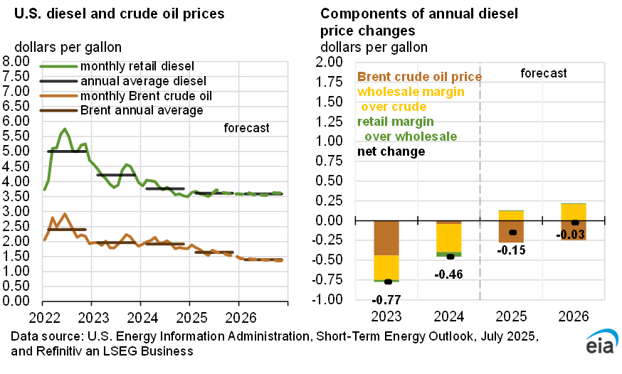 - U.S. crude oil production. Declining oil prices have contributed to U.S. producers slowing their drilling and completion activity this year. As a result, we forecast U.S. crude oil production will decline from an all-time high of just over 13.4 million barrels per day (b/d) in the second quarter of 2025 (2Q25) to less than 13.3 million b/d by 4Q26. On an annual basis, we now forecast crude oil production will average 13.4 million b/d in both 2025 and 2026.