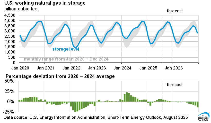 - Natural gas prices. We expect the Henry Hub natural gas spot price will rise from an average of $3.20 per million British thermal units (MMBtu) in July to $3.90/MMBtu in 4Q25 and $4.30/MMBtu next year. Rising natural gas prices reflect relatively flat natural gas production amid an increase in U.S. liquefied natural gas exports.