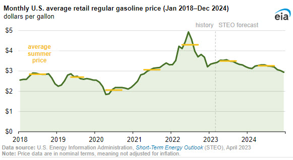 Weekly U.S. gasoline prices averaged $3.42/gal in March—3 cents/gal higher than in February and 80 cents/gal lower than in March 2022. We estimate retail gasoline prices will increase to $3.53/gal in April and remain above $3.45/gal through August.