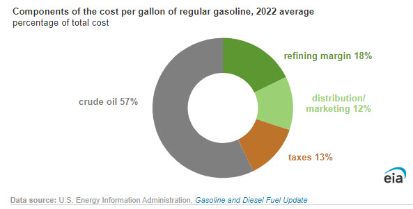 We assume in the STEO that crude oil is the main determining factor in retail gasoline prices. According to our Gasoline and Diesel Fuel Update, the crude oil price usually accounts for more than half of the final retail gasoline price. In 2022, crude oil accounted for 57% of the retail gasoline price. The next largest share of the gasoline price, 18% in 2022, is the refinery margin, measured as the wholesale spot price of gasoline minus the crude oil price. The refining margin accounts for the value of refining crude oil into gasoline. The remaining difference between the gasoline spot price and the gasoline retail price is fuel taxes and the distribution costs of marketing and moving the gasoline to the retail station.