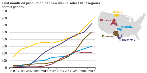 U.S. tight oil production increased in 2017, accounting for 54% of total U.S. crude oil production, in part because of the increasing productivity of new wells. Since 2007, the average first full month of oil production from new wells in regions tracked by EIA’s Drilling Productivity Report (DPR) has generally increased. These growing initial production rates have helped tight oil production to increase despite slowdowns in drilling activity when oil prices fell.