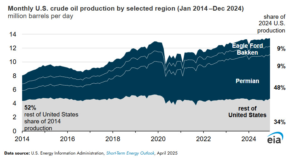 U.S. crude oil production grew by 270,000 barrels per day (b/d) in 2024 to average 13.2 million b/d, according to our Petroleum Supply Monthly. Almost all the production growth came from the Permian region.