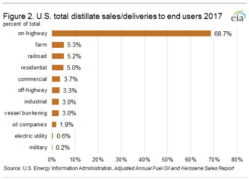 Distillate use varies widely by geography and U.S. Petroleum Administration for Defense District (PADD) because of region-specific industries and weather patterns. The Midwest (PADD 2) has the largest regional consumption of distillate, with average product supplied of 1.28 million b/d in 2018, closely followed by the East Coast (PADD 1), with a product supplied of 1.26 million b/d. In all regions, on-highway transportation consumes the largest amount of distillate. Both light- and heavy-duty vehicles accounted for 69% of total U.S. distillate end use in 2017, the latest data available. After on-highway transportation, farming and railroad transportation are the second- and third-largest end uses for distillate in the United States (Figure 2).