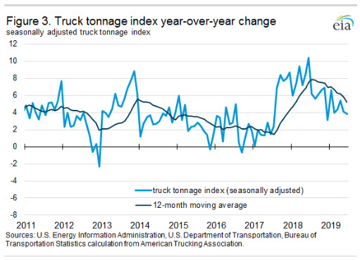 U.S. total distillate consumption, as measured by product supplied, has been approximately 1.2% lower during the first eight months of 2019 than it was during the same period in 2018. Distillate fuel is linked with economic growth because of its many uses in multiple sectors. Distillate is used by multiple transportation modes as a fuel to move freight and people, by commercial and industrial heavy machinery to build and produce goods, in agriculture for farming, and in residential and commercial sectors as a heating fuel. Trends in several of these end-use sectors explain some of the reasons behind slowing demand growth for distillate fuel in the United States.
