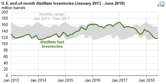 Inventories of distillate fuel, a category that includes both diesel and home heating oil, were 117.7 million barrels at the end of June, the lowest end-of-June level since 2004. Distillate inventories have generally been lower than the previous five-year (2013–2017) average throughout 2018. Relatively low inventory levels reflect growth in distillate consumption during 2018 that has not been fully offset by increased domestic refinery production or by lower net exports of distillate.