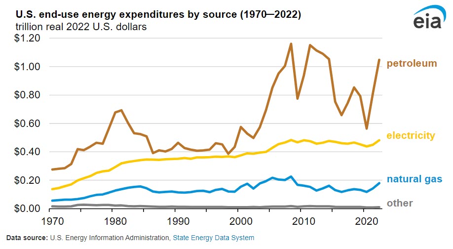 Petroleum: U.S. end-use energy expenditures for petroleum totaled $1 trillion in 2022, a 29% increase from 2021 when adjusted for inflation. The rise is primarily due to high prices for motor gasoline, distillate fuel oil, and jet fuel in the transportation sector. Together, the three fuels accounted for 96% of petroleum consumed in the transportation sector in 2022. Petroleum products used for purposes other than generating electricity made up the largest share (61%) of U.S. end-use energy expenditures in 2022.