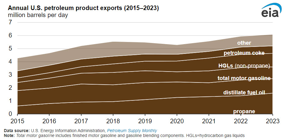 Petroleum product exports from the United States averaged a record 6.1 million barrels per day (b/d) in 2023, a 2.5% increase from 2022, according to our Petroleum Supply Monthly. Propane drove the growth in U.S. petroleum product exports, offsetting decreases in gasoline and distillate exports.