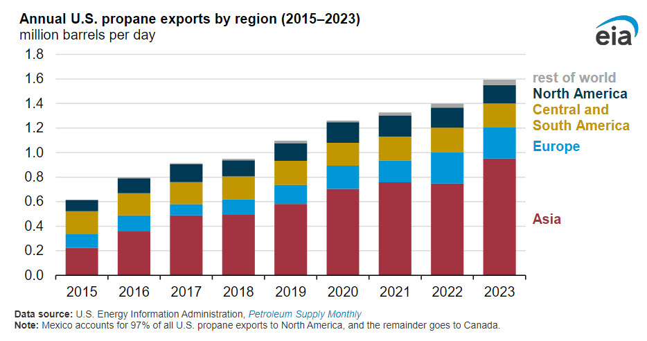 Growing 14% in 2023, U.S. propane exports averaged 1.6 million b/d in 2023, establishing an annual record high. Propane exports made up 26% of all U.S. petroleum product exports, more than any other petroleum product. Propane is consumed globally for space heating and is increasingly used as a petrochemical feedstock in East Asia. Propane consumption as a petrochemical feedstock has been driven by propylene production in East Asia. Propylene is a base chemical used to manufacture polypropylene, a fiber used to make car interiors, packaging, and personal protective equipment.