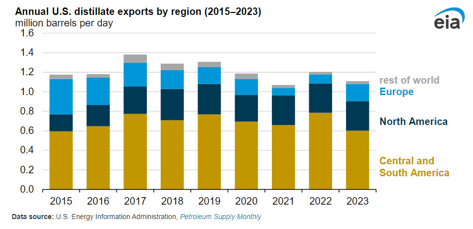 Distillate fuel has been the second-highest U.S. petroleum product export since 2020, after propane. In 2023, U.S. exports of distillate fuel oil decreased by 8% to 1.1 million b/d. The United States typically exports more distillate fuel to Central America and South America than to any other region, which was true in 2023, when the region accounted for 54% of all U.S. distillate exports. Despite the region’s top ranking, U.S. exports of distillate to the region were 23% lower in 2023 compared with 2022, decreasing to 602,000 b/d, the lowest since 2015. Mexico remained the top destination country in 2023, when U.S. exports of distillate averaged 291,000 b/d.