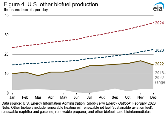 As renewable diesel production grows, we also expect growth in the production of sustainable aviation fuel (SAF) and other biofuels that we capture in our “other biofuels” production data (Figure 4). We forecast U.S. production of these other biofuels to more than double from 2022 by 2024. Much of this growth will come from the renewable naphtha and renewable propane produced as coproducts of renewable diesel production and from the SAF produced at renewable diesel plants that plan to produce both. Because renewable diesel plants can produce other biofuels, we expect increases in renewable diesel production to facilitate a portion of our forecast increase for other biofuels production.