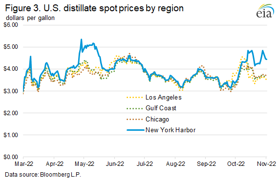 Prices at the New York Harbor pricing benchmark are higher relative to other U.S. benchmarks at Chicago, the Gulf Coast, or Los Angeles (Figure 3). The ULSD spot price at New York Harbor averaged 56 cents/gal higher than the Gulf Coast benchmark in October, compared with 17 cents/gal higher from January through September 2022. The reason for the increase at New York Harbor in October is a combination of normal seasonal increases in demand, abnormally low inventories, and limited distillate supplies available for import. As we discussed in our Winter Fuels Outlook, U.S. distillate demand is seasonal, in part because of its use in home heating mostly in the Northeast. The beginning of the winter demand cycle for home heating oil is likely the primary catalyst for rising prices because rising seasonal demand is drawing on already substantially strained regional inventories.