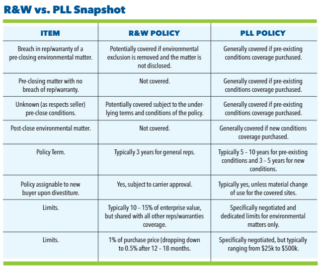 In addition, the PLL policy can also be structured to cover new conditions that arise post-close. Since it is a new environmental condition that didn’t exist pre-closing, it cannot be covered by R&W insurance. The PLL policy, however, can provide new conditions coverage if elected by the buyer when purchasing the policy.