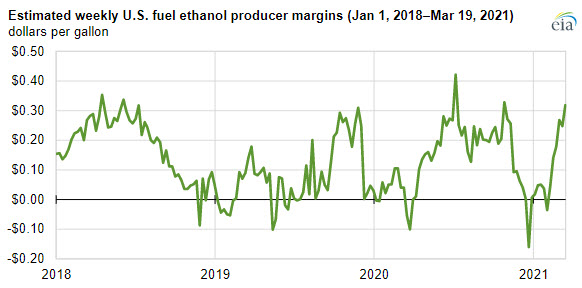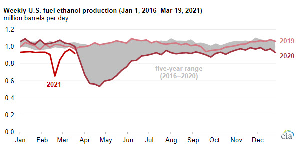 U.S. weekly inventories of fuel ethanol fell to 21.3 million barrels as of March 12, 2021, which marked the fourth consecutive weekly inventory withdrawal at a time when inventories typically build as we head into the summer driving season. The March 12 inventory level was 13% less than at the same time last year and the lowest inventory level since November 27, 2020, when fuel ethanol production and inventories began increasing after reaching five-year lows, which occurred as a result of responses to COVID-19. Fuel ethanol prices and producer margins have since returned to average levels. Elevated prices for fuel ethanol Renewable Identification Numbers (RINs) should also help drive higher fuel ethanol production rates and prompt fuel ethanol inventories to build closer to their normal seasonal averages in the coming weeks, as evidenced by the slight increase to 21.8 million barrels as of March 19, 2021.