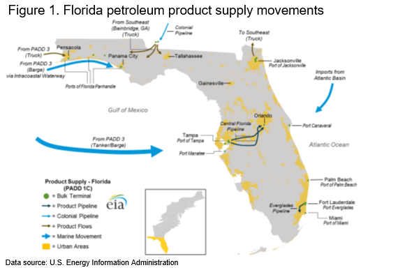 The only petroleum product that enters Florida through a pipeline is sourced from a terminal in Bainbridge, Georgia, that is connected to the Colonial Pipeline system and supplies the Florida panhandle by long-distance tanker truck. The rest of western Florida is supplied by truck and barge via the Intracoastal Waterway from nearby refineries in Alabama and Mississippi (Figure 1). Refined product terminals in the Tampa area were reportedly halting operations on Tuesday evening in preparation for the storm’s impact on the city. Miami and Fort Lauderdale are also likely to experience delays in marine shipments in response to difficult weather conditions.