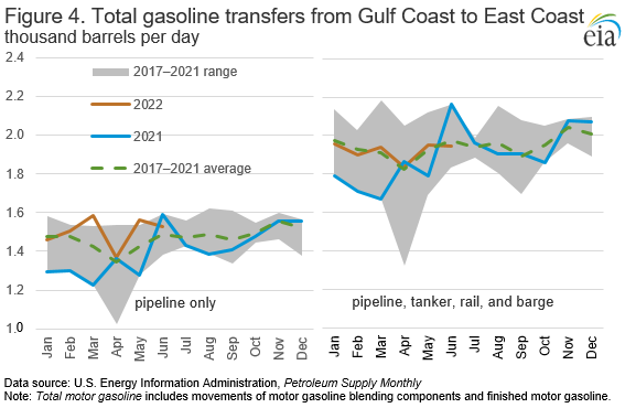 Total gasoline flows from the Gulf Coast to the East Coast were near the five-year (2017–2021) average in the first half of this year, while flows by pipeline were above average (Figure 4). Movements of gasoline by pipeline from the Gulf Coast to the East Coast accounted for 78% of all gasoline movements from the Gulf Coast to the East Coast. Gulf Coast pipeline movements alone also accounted for 50% of all gasoline consumed along the East Coast during that period.
