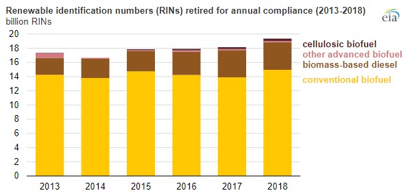 In November 2018, EPA issued the 2019 final volume requirements for cellulosic biofuels, advanced biofuels, and renewable fuels, as well as the 2020 volume requirements for biomass-based diesel. In that rule, EPA calculated 2019 RVO percentages from the total supply of gasoline and diesel transportation fuels that the U.S. Energy Information Administration (EIA) had forecast in its October 2018 Short-Term Energy Outlook. Based on EPA renewable identification number (RIN) data for 2018, 95% of RINs generated under the RFS were made up of conventional biofuel (mainly corn starch ethanol) and biodiesel.