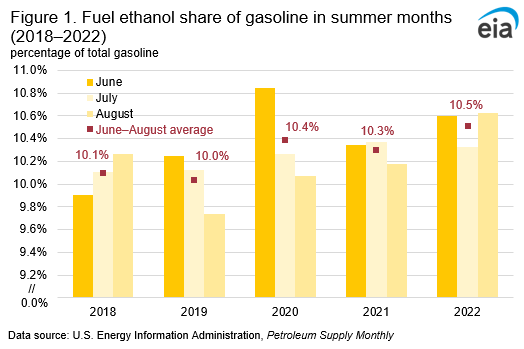 In the summer of 2022 (June—August), the price of fuel ethanol was lower than the price of the petroleum component of gasoline, which led to record-high fuel ethanol levels (blend rates) in gasoline sold in the United States. In addition, on April 29, 2022, the U.S. Environmental Protection Agency (EPA) issued an emergency fuel waiver to allow E15 gasoline, which is a gasoline blend of 15% fuel ethanol, to be sold during the summer driving season in all regions of the United States. Without the waiver, E15 cannot be sold during the summer at retail stations in areas that do not have a reformulated gasoline (RFG) program—which is about two-thirds of the country.