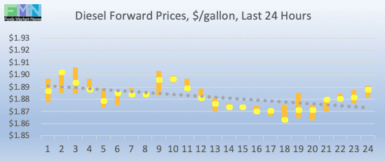Diesel opened on the NYMEX at $1.8828/gallon today, down by 1.67 cents (0.87%) from Friday’s opening price of $1.8995/gallon. Over the past 24 hours from 9AM EST to 9AM EST, diesel prices declined by 0.86 cents (0.45%.) Diesel prices currently are stabilizing in the range of $1.88-$1.90/gallon. The latest price is $1.8906/gallon.