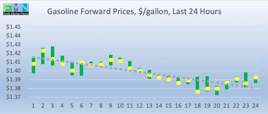 Gasoline opened on the NYMEX at $1.408/gallon today, a decline of 1.35 cents (0.93%) from Friday’s opening price of $1.4215 cents/gallon. Over the past 24 hours from 9AM EST to 9AM EST, gasoline prices fell by 2.21 cents (1.57%.) Prices currently appear to be trending down, and they are in the range of $1.37-$1.40/gallon. The latest price is $1.3955/gallon.