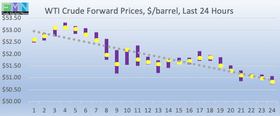 WTI (West Texas Intermediate) crude forward prices opened at $51.73/b today, down by $0.55 (1.05%) from Friday’s opening price of $52.28/b. Over the past 24 hours from 9AM EST to 9AM EST, WTI crude prices fell by $1.63 (3.1%.) Prices are trading up and down currently, but they are managing to remain above $51/b. The latest price is $51.26/b.