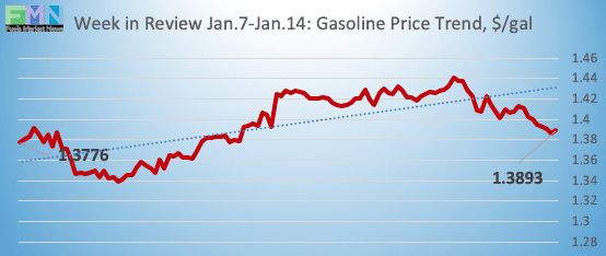 Gasoline opened on the NYMEX at $1.3693/gallon today, down by 3.87 cents (2.73%) from yesterday’s opening price of $1.408 cents/gallon. Over the past 24 hours from 9AM EST to 9AM EST, gasoline prices fell by 0.46 cents (0.33%.) Prices currently appear to be recovering back into the range of $1.38-$1.40/gallon. The latest price is $1.3916/gallon.