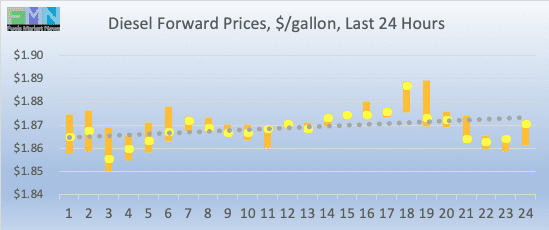 Diesel opened on the NYMEX at $1.8679/gallon today, up by 1.01 cents (0.54%) from yesterday’s opening price of $1.8578/gallon. Over the past 24 hours from 9AM EST to 9AM EST, diesel prices rose by 0.48 cents (0.26%.) Diesel prices currently are volatile, trading mainly in the range of $1.86-$1.88/gallon. The latest price is $1.8765/gallon.