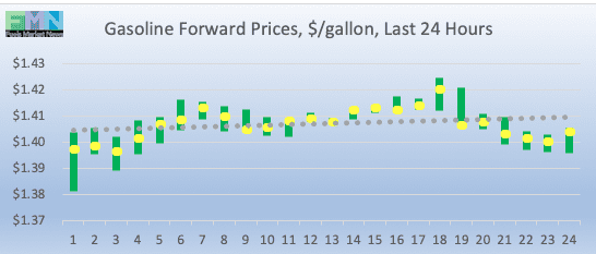 Gasoline opened on the NYMEX at $1.4125/gallon today, up by 4.32 cents (3.05%) from yesterday’s opening price of $1.3693 cents/gallon. Over the past 24 hours from 9AM EST to 9AM EST, gasoline prices rose by 1.71 cents (1.24%.) Prices currently are trading the range of $1.38-$1.41/gallon. The latest price is $1.4052/gallon.