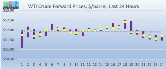 WTI (West Texas Intermediate) crude forward prices opened at $52.00/b today, up by $1.22 (2.4%) from yesterday’s opening price of $50.78/b. Over the past 24 hours from 9AM EST to 9AM EST, WTI crude prices rose by $0.40 (0.78%.) Prices are trading up and down currently, but they are managing to remain in the $51.50-$52.00/b range. The latest price is $51.88/b.