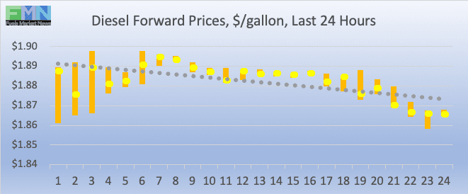Diesel opened on the NYMEX at $1.8921/gallon today, up by 2.42 cents (1.28%) from yesterday’s opening price of $1.8679/gallon. Over the past 24 hours from 9AM EST to 9AM EST, diesel prices weakened slightly by 0.27 cents (0.14%.) Diesel prices currently are trading mainly in the range of $1.86-$1.89/gallon. The latest price is $1.8697/gallon.