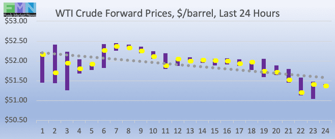 WTI (West Texas Intermediate) crude forward prices opened at $52.30/b today, up by $0.3 (0.58%) from yesterday’s opening price of $52.00/b. Over the past 24 hours from 9AM EST to 9AM EST, WTI crude eased slightly by $0.18 (0.35%.) Prices are trading up and down currently, but they are managing to remain above $51/b. The latest price is $51.56/b.
