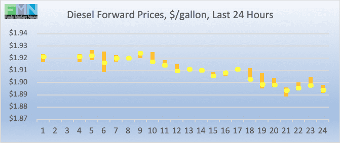 Diesel opened on the NYMEX at $1.9115/gallon today, up by 2.73 cents (1.42%) from Friday’s opening price of $1.8842/gallon. Over the past 24 hours from 9AM EST to 9AM EST, diesel prices fell by 2.0 cents (1.04%.) Diesel prices currently are easing, trading mainly in the range of $1.88-$1.91/gallon. The latest price is $1.8937/gallon.