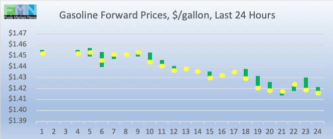 Gasoline opened on the NYMEX at $1.4435/gallon today, up by 1.54 cents (1.05%) from Friday’s opening price of $1.4281 cents/gallon. Over the past 24 hours from 9AM EST to 9AM EST, gasoline prices dropped by 3.37 cents (2.32%.) Prices currently are continuing to ease, trading the range of $1.41-$1.44/gallon. The latest price is $1.4168/gallon.