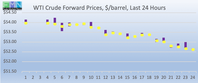 WTI (West Texas Intermediate) crude forward prices opened at $53.73/b today, up by $1.50 (2.87%) from Friday’s opening price of $52.23/b. Over the past 24 hours from 9AM EST to 9AM EST, WTI crude fell by $1.35 (2.50%.) Prices are trending down currently, retreating from peaks that hit the $54/b mark. The latest price is $52.70/b.