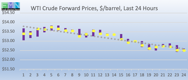 WTI (West Texas Intermediate) crude forward prices opened at $53.36/b today, up by $0.39 (0.73%) from Friday’s opening price of $53.17/b. Over the past 24 hours from 9AM EST to 9AM EST, WTI crude prices fell by $0.56 (1.05%.) Prices are trending down currently. Prices first fell below the $53/b level they had achieved last week, and currently prices are dipping even below $52/b. The latest price is $51.99/b.