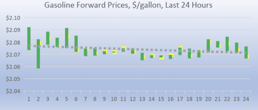 Gasoline opened on the NYMEX at $2.07 today, down by 1.41 cents (0.67%) from yesterday’s opening. Over the last 24-hour trading period from 9AM EST to 9AM EST, gasoline prices decreased by 1.74 cents/gallon (0.83%.) This morning, gasoline prices surged, then quickly fell, and gasoline prices currently are falling. The latest price is $2.0562/gallon.