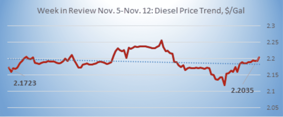 Diesel opened on the NYMEX at $2.0769/gallon today, down by 1.8 cents (0.85%) from yesterday’s opening price. Over the last 24-hour period from 9AM EST to 9AM EST, diesel prices recovered by 1.33 cents/gallon (0.64%.) Currently, diesel prices are rising gently. The latest price is $2.0939/gallon.