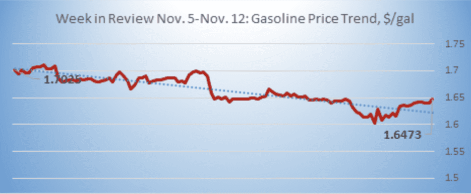 Gasoline opened on the NYMEX at $1.5555/gallon today, a modest recovery of 0.79 cents (0.50%) from yesterday’s opening price of $1.5476/gallon. Over the last 24-hour trading period from 9AM EST to 9AM EST, gasoline prices recovered by 2.4 cents/gallon (1.53%.) Currently, gasoline prices are slowly trending up. The latest price is $1.589/gallon.
