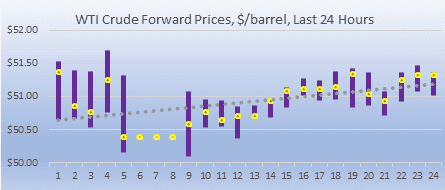 WTI (West Texas Intermediate) crude prices opened on today’s NYMEX session at $50.62/b, a major drop of $4.04 (7.39%) from Friday’s opening price of $54.66/b. This was the lowest opening price since mid-March 2017. Over the last 24-hour period from 9AM EST to 9AM EST, crude futures recovered by $0.55/b (1.08%.) Currently, crude prices are trending back up slowly, and they are back above $51/b. The latest price is $51.79/b.