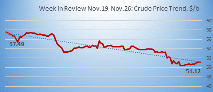 Crude oil futures prices caved in over Thanksgiving week, crashing below the $51/b mark and coming close to falling below the $50/b barrier as well. Oil futures contracts seemed to join many consumer goods in offering a Black Friday sale. WTI (West Texas Intermediate) crude prices opened at $50.62/b today, a major drop of $4.04 (7.39%) from Friday’s opening price of $54.66/b. Prices are back to where they were approximately three years ago. Gasoline and diesel also collapsed. Last week ended seriously in the red. Markets today appear to be in the process of stabilizing, with stock markets recovering some of their recent losses.