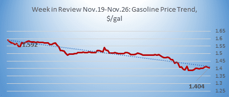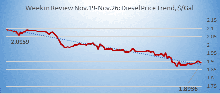 During the week ended November 23rd, WTI forward prices dropped by $6.61/b (11.6%,) falling from $57.03/b on Monday November 19th to $50.42/b on Friday, November 23rd. Gasoline futures prices opened at $1.5778/gallon on Monday, plummeting by 18.65 cents (11.8%) to end at $1.3913/gallon on Friday. Diesel futures prices opened at $2.0786/gallon on Monday, dropping by 20.24 cents (9.7%) to close at $1.8762/gallon on Friday.